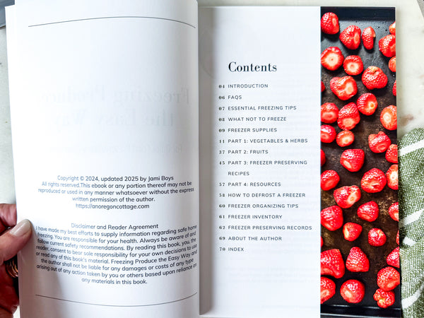 Description: Freeze your garden bounty with confidence using simple methods that truly work. Freezing Produce the Easy Way: Quick Food Preservation for Busy People is your go-to guide for preserving fresh fruits and vegetables without the stress. This 72-page, soft cover, full color cookbook is made to use right in your kitchen. Inside, you’ll find 30+ step-by-step tutorials that show exactly how to freeze your produce with confidence, plus simple tips and a short list of supplies (no fancy equipment needed!). Also included are bonus recipes for using your frozen foods in everyday meals, as well as resources like a freezer defrosting tutorial, a freezer record, and inventory pages. Freezing your harvest has never been this easy or this doable.